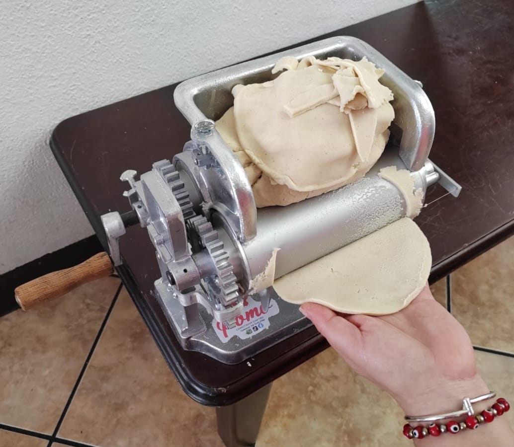 La máquina tiene la capacidad de ajustar los rodillos para hacer la tortilla con el grosor que usted desee.